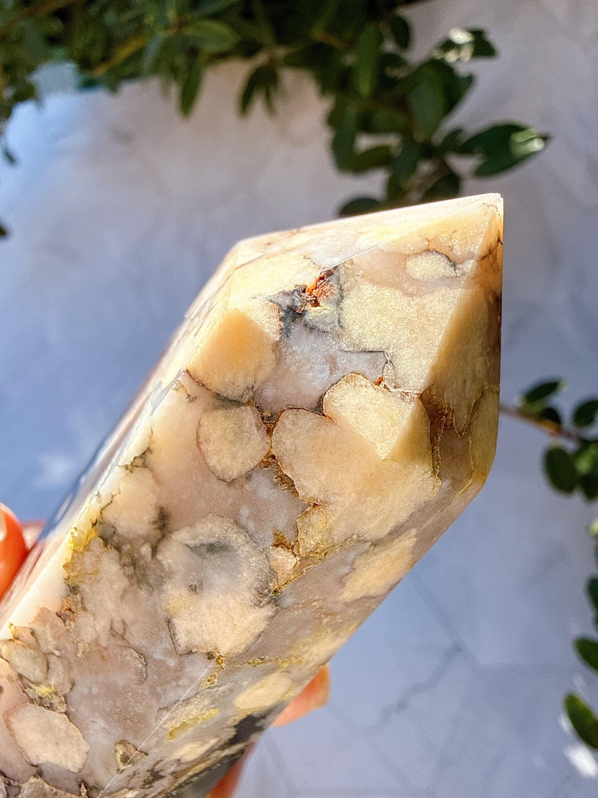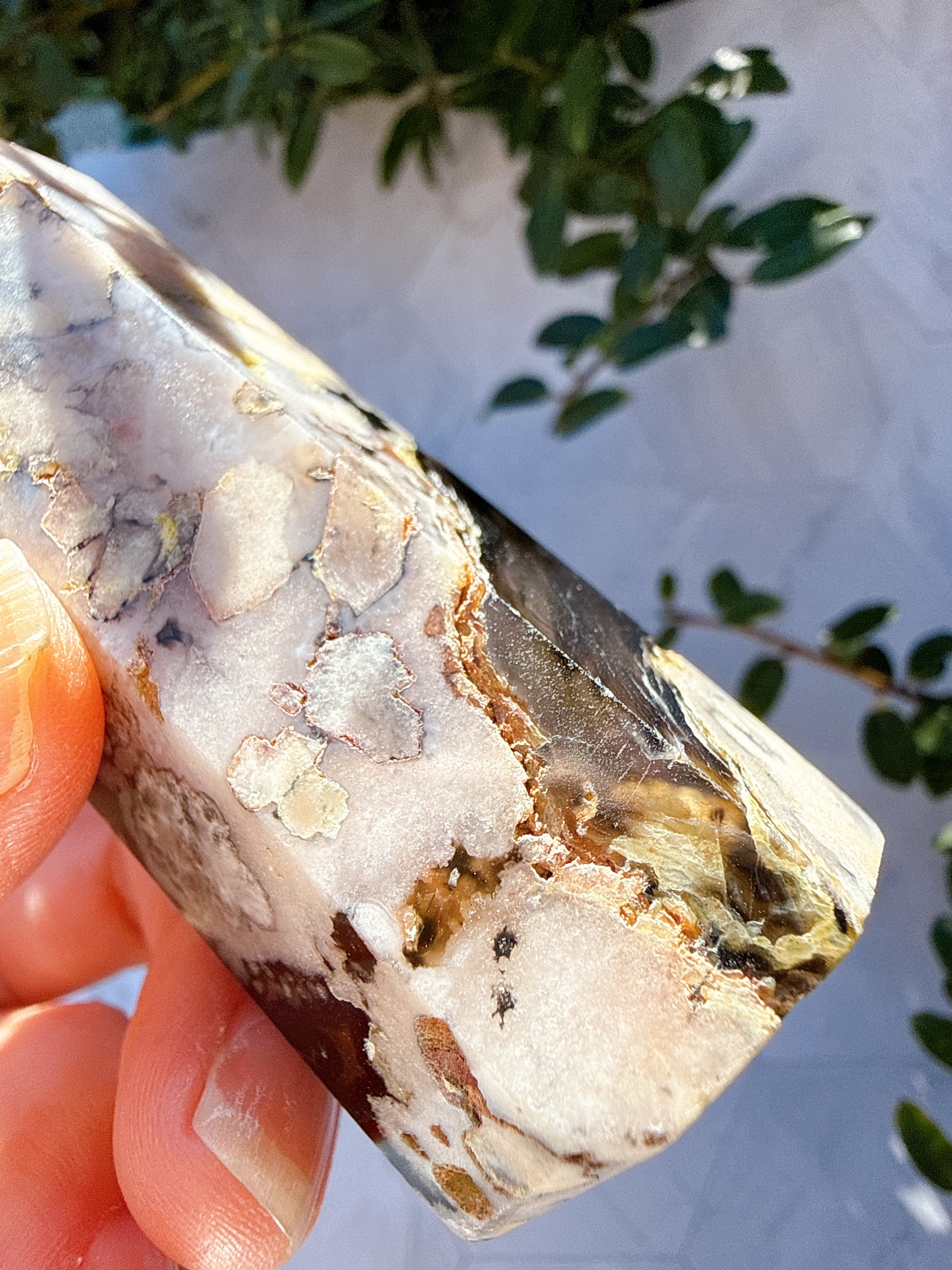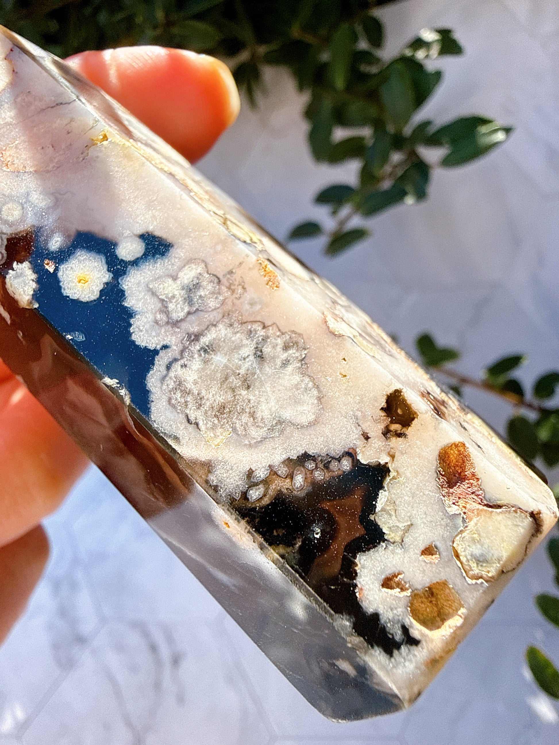 白い花模様のインクルージョンが現れるアゲート