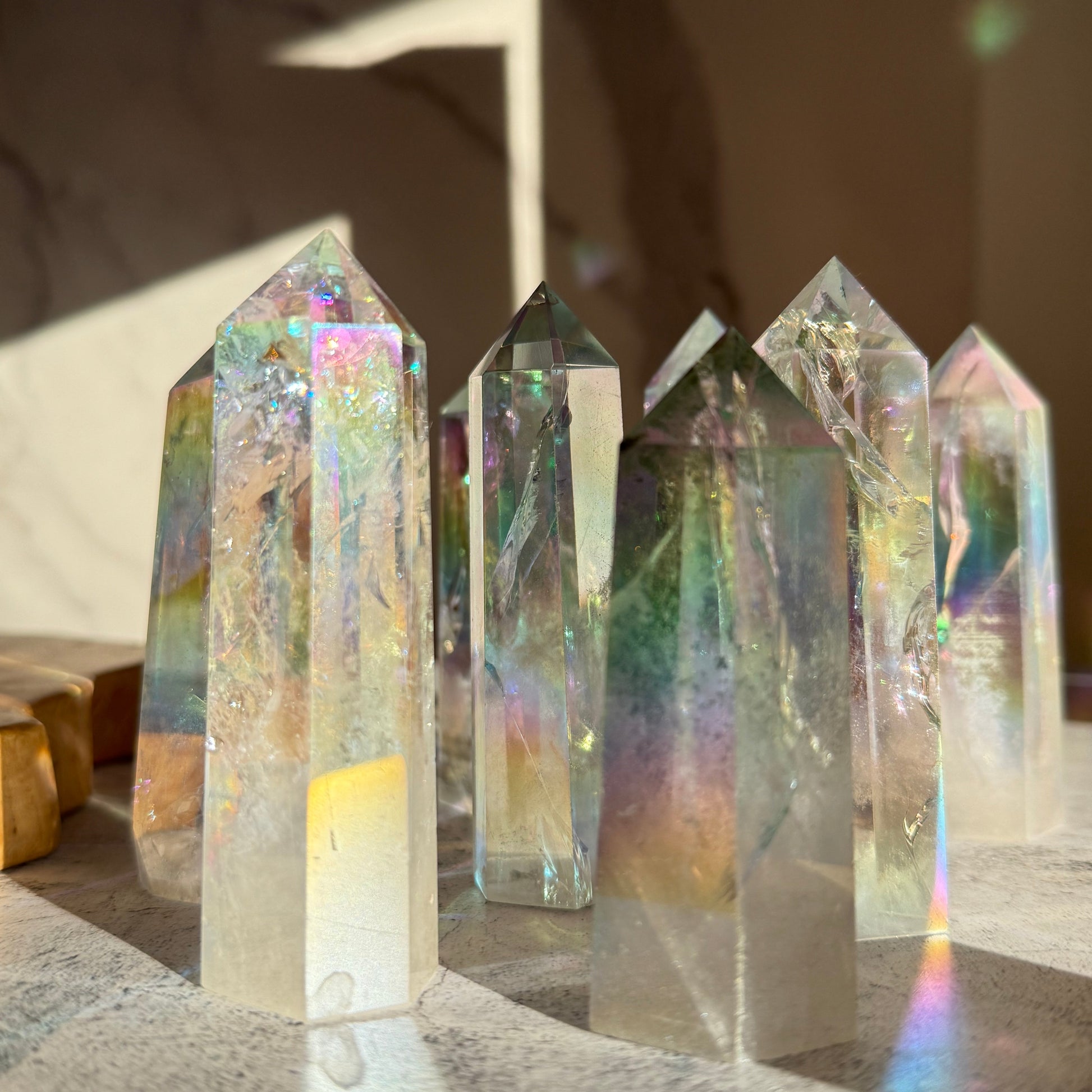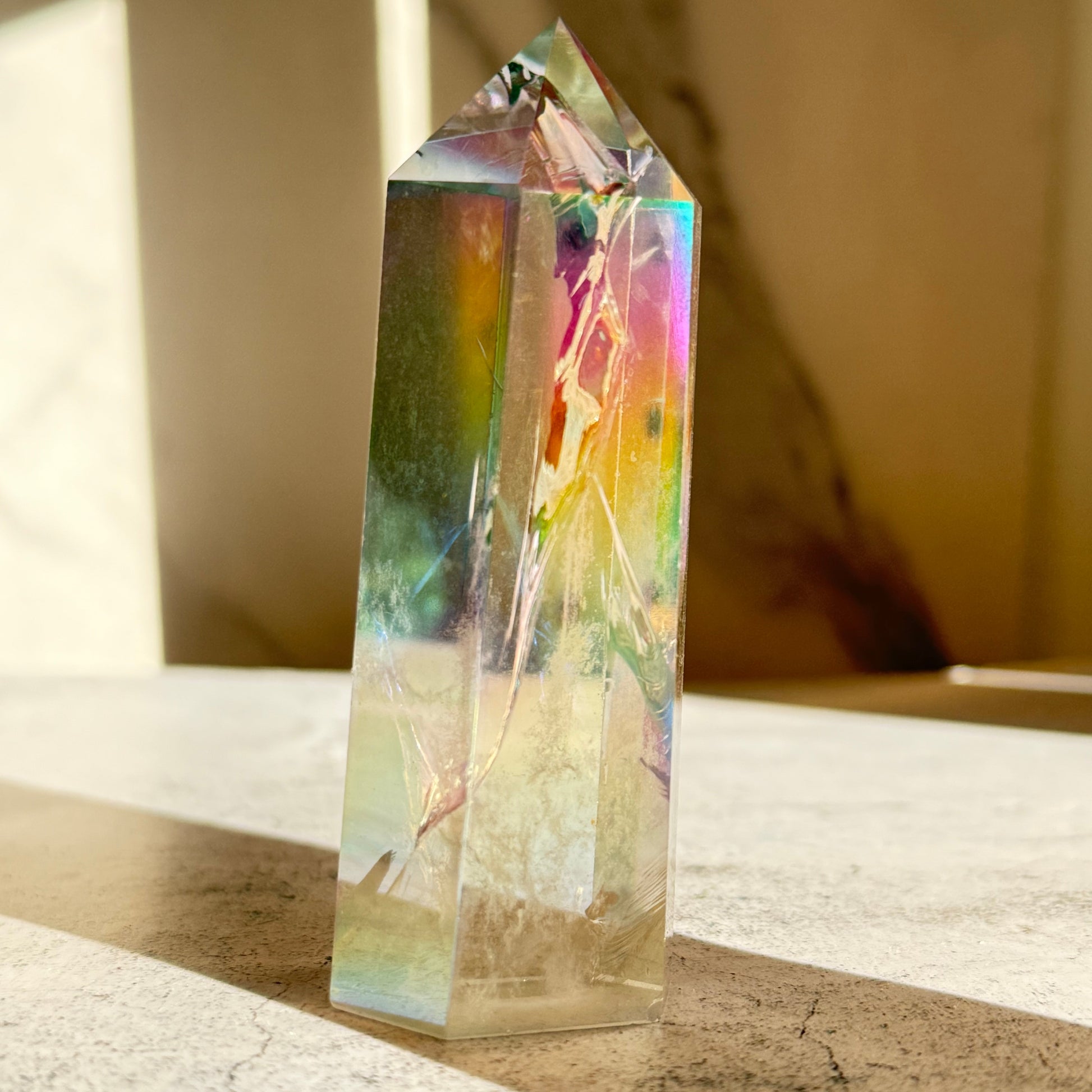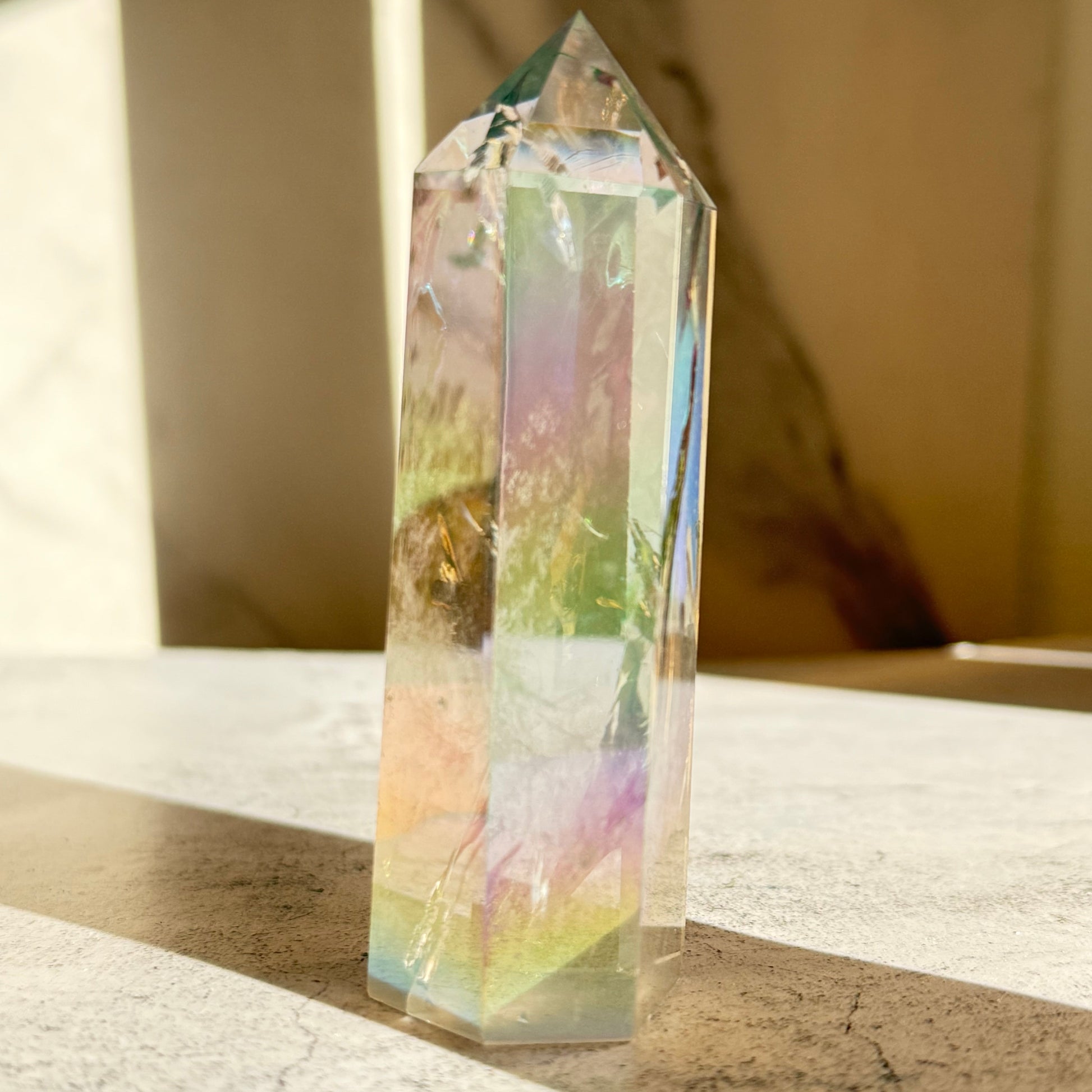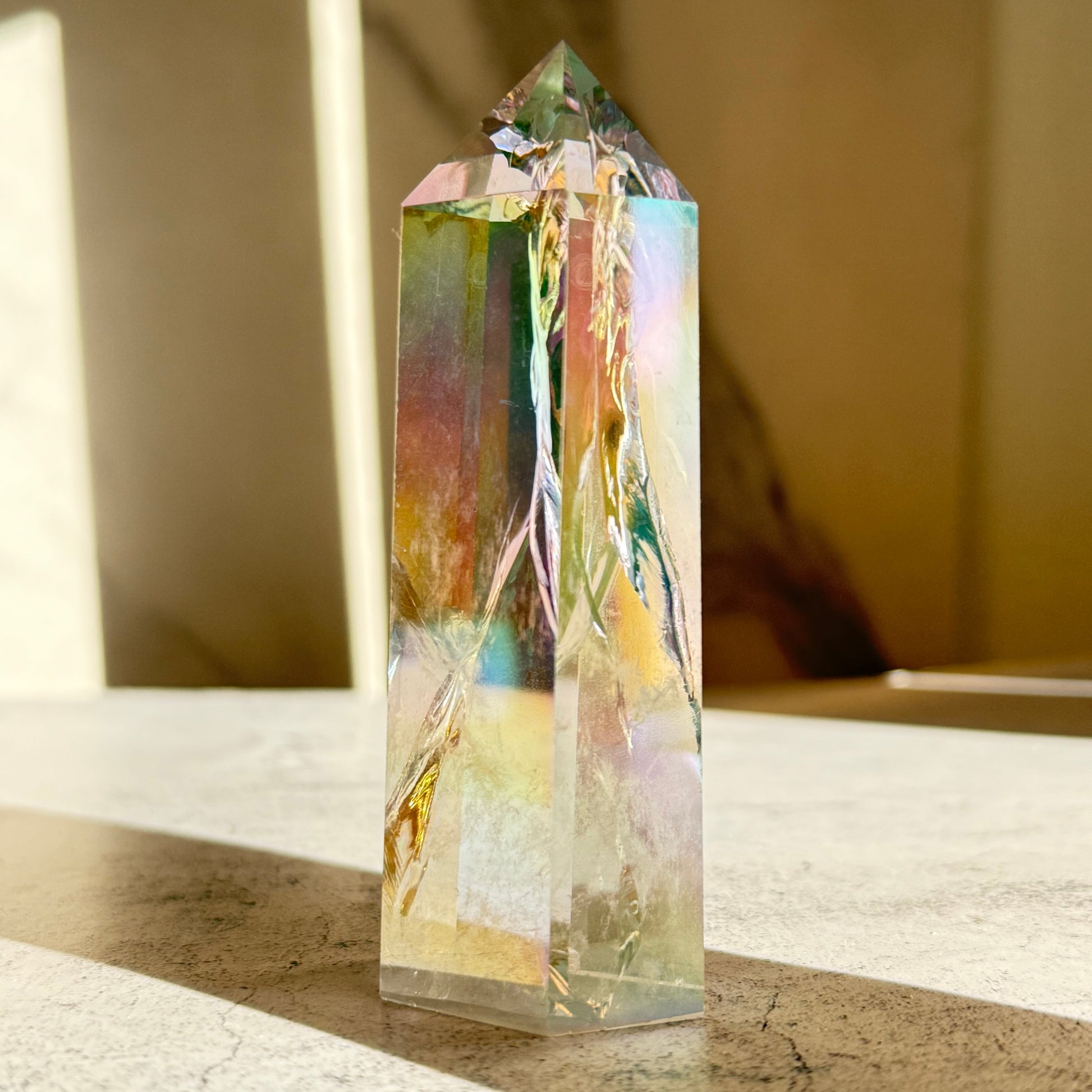 まるで虹のしずくを閉じ込めたように輝く、エンジェルオーラクォーツのタワー。