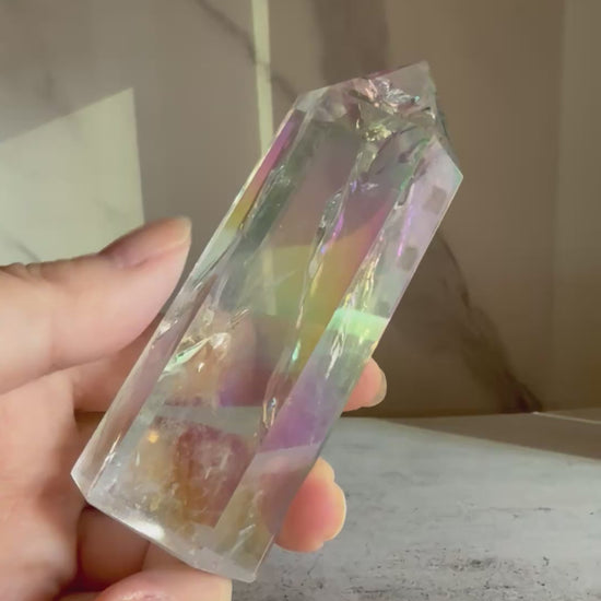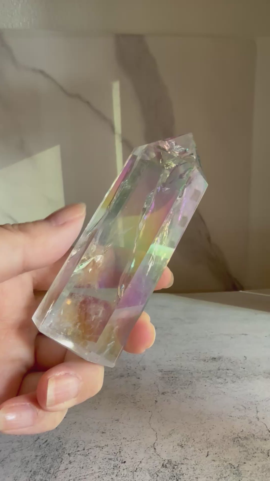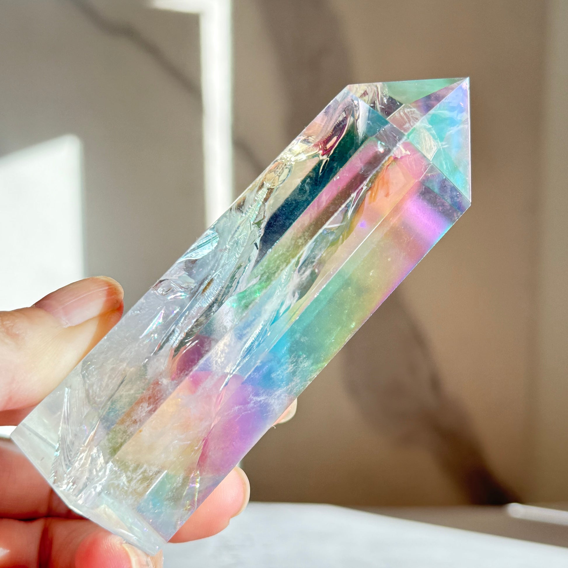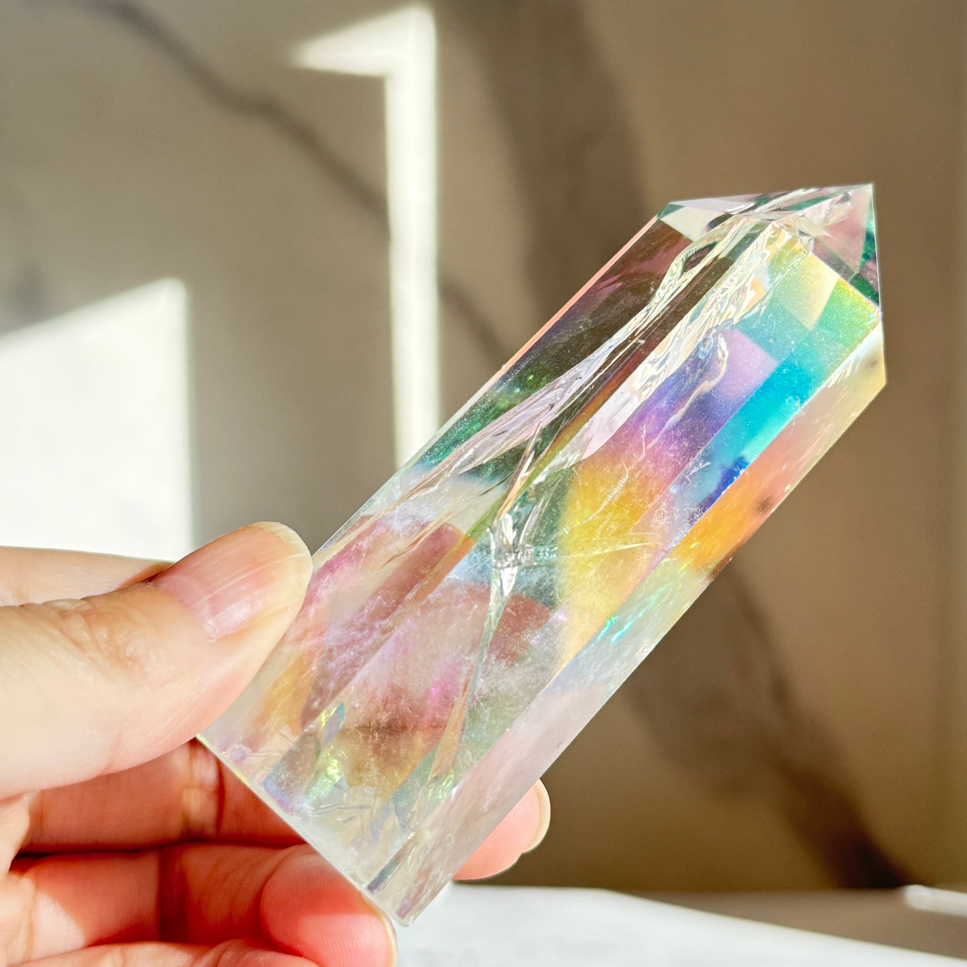 まるで虹のしずくを閉じ込めたように輝く、エンジェルオーラクォーツのタワー。