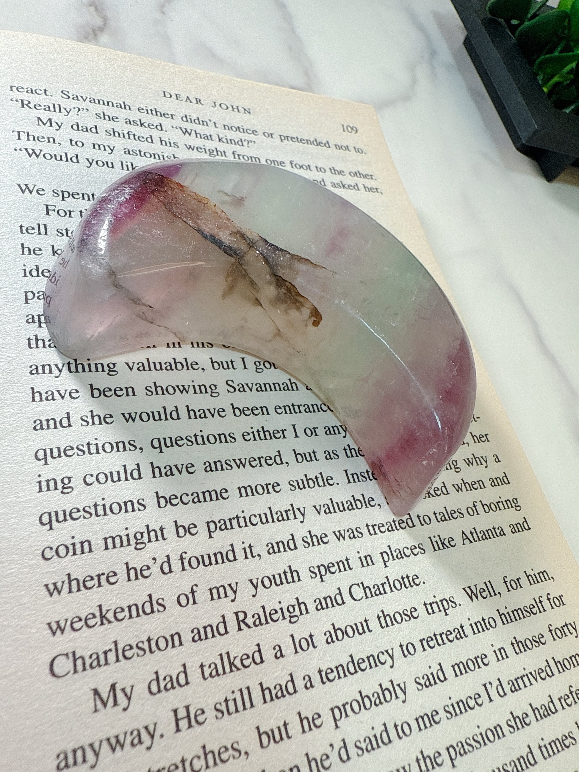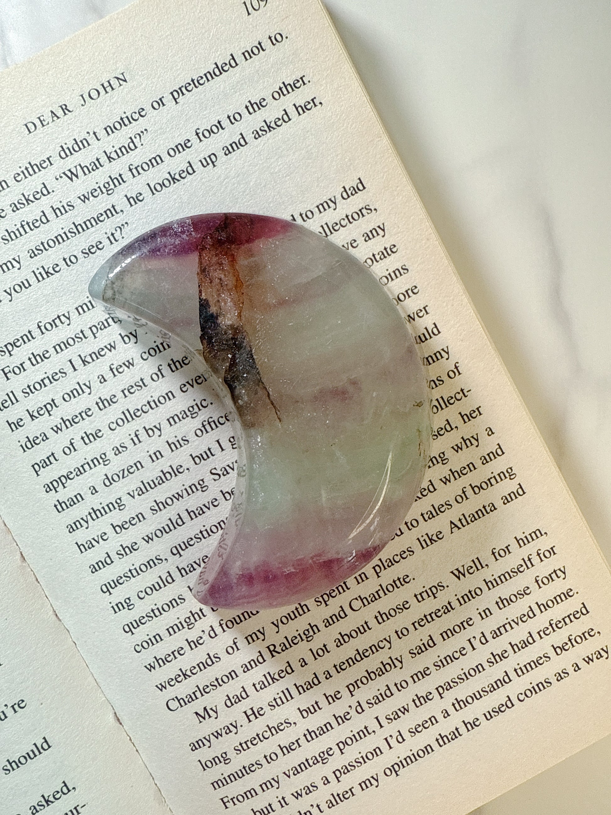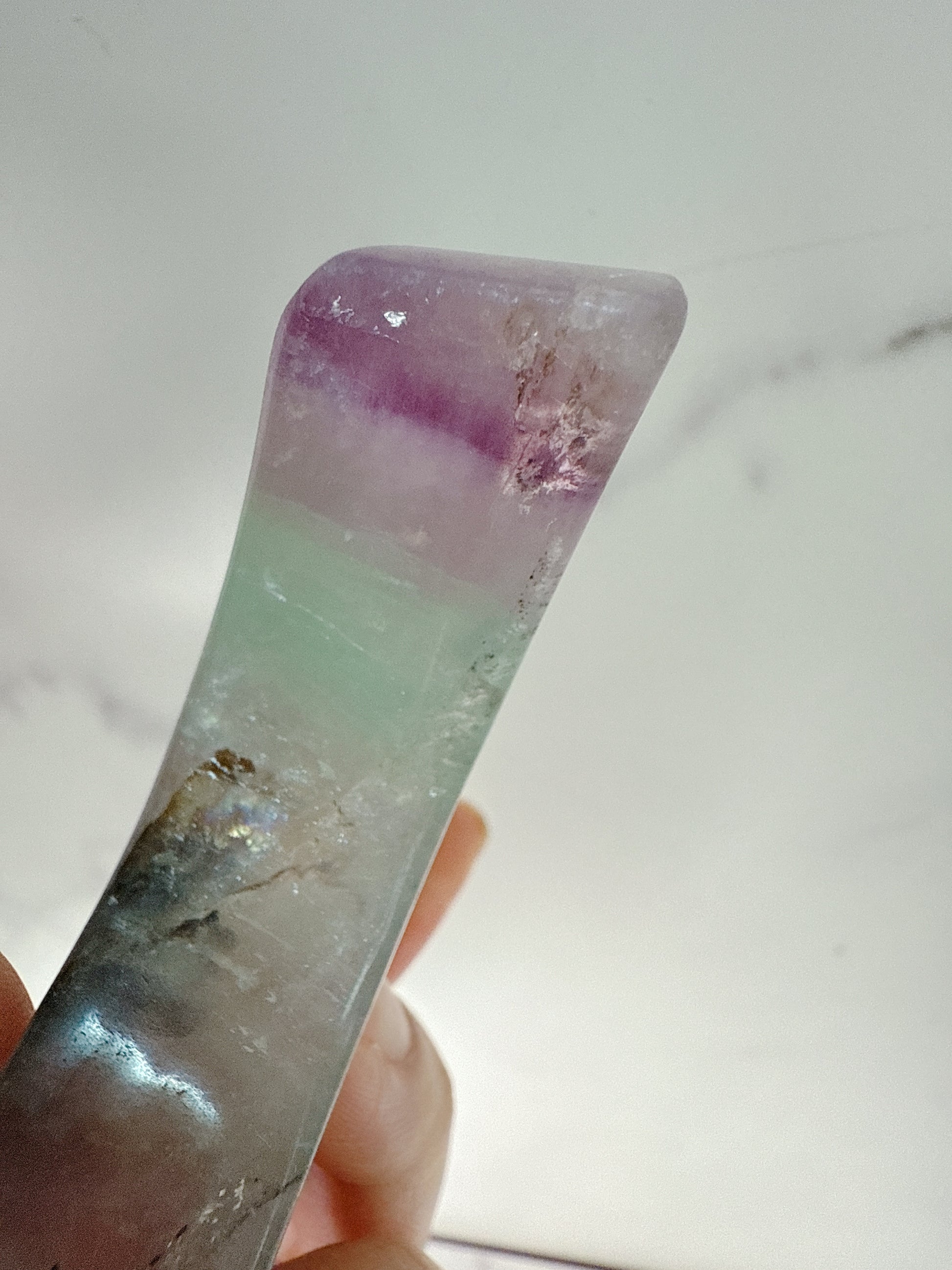 深い夜空を映すかのような、柔らかいグリーンとパープルのグラデーションが美しいフローライトの月型のトレイ。